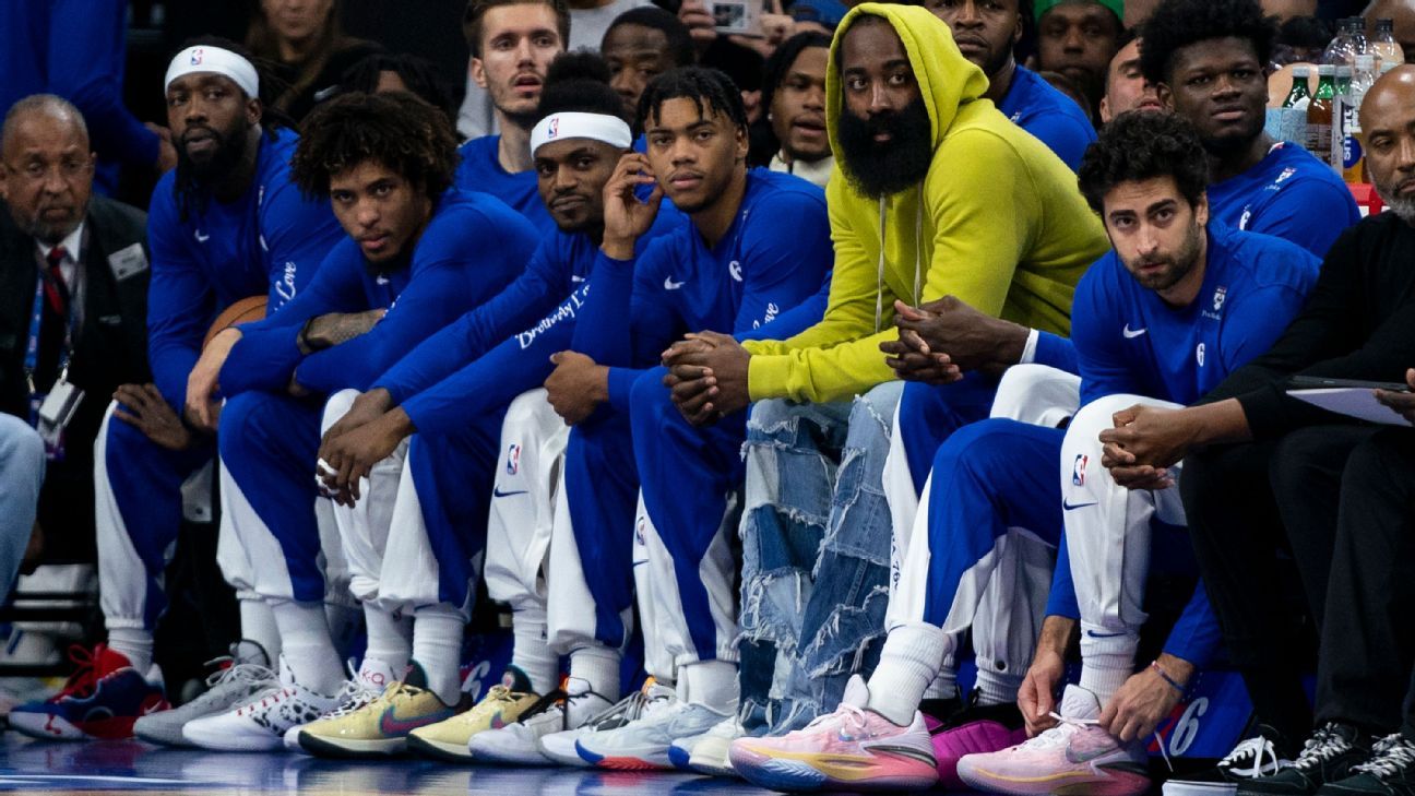 Harden had yet to play for Philadelphia this season, though he was on the bench with his teammates during Sunday’s game, wearing jeans and a green hoodie, after participating in the 76ers’ pregame walkthrough and video session.