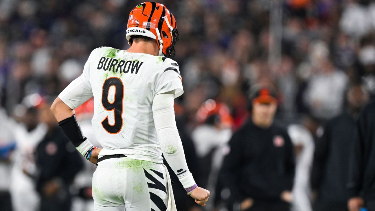 Cincinnati is projected to be the underdog in six of its final seven games, according to ESPN Analytics. The exception is a Week 14 home game against the Indianapolis Colts. The Bengals still have to play the Jacksonville Jaguars and Kansas City Chiefs on the road and have three remaining AFC North games, including two against the Pittsburgh Steelers. Even if Burrow had finished the Ravens’ loss healthy, Cincinnati was going to be outside looking in on the playoff picture.