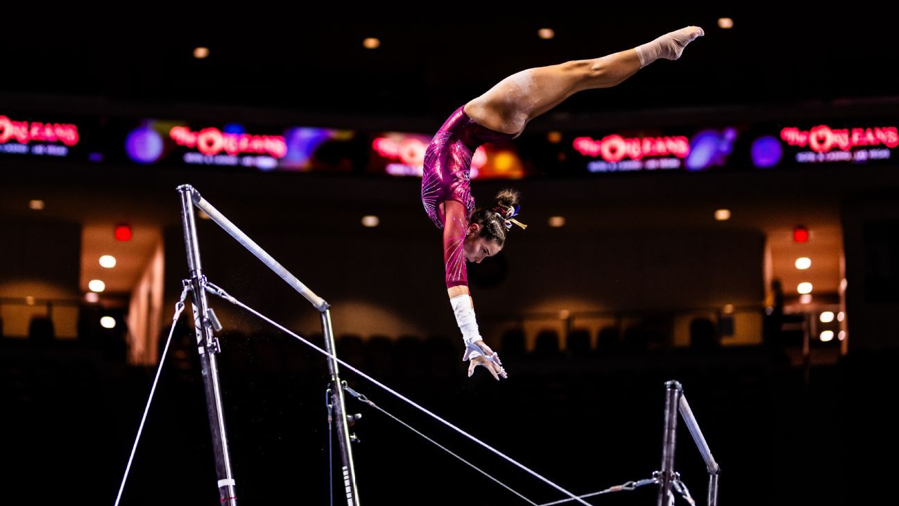 McClain became just the seventh gymnast in school history to earn the score on bars, and the first on the road since 2019. With a super-difficult opening release move, textbook lines and handstands and a perfectly stuck dismount, McClain more than lives up to the hype that preceded her arrival in Baton Rouge.