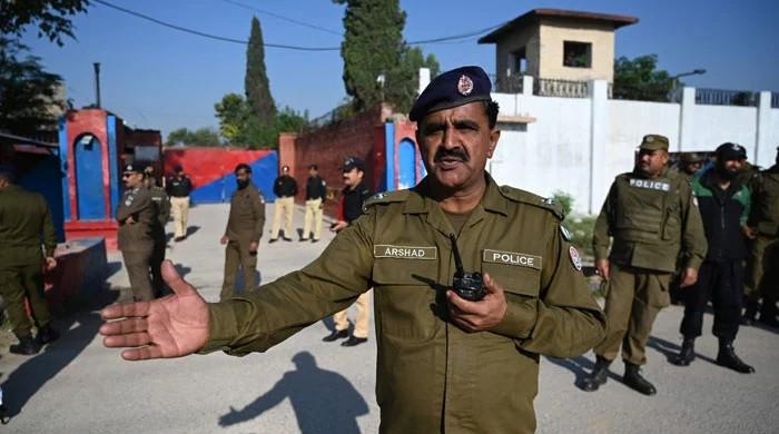 Police officials stand guard outside the Adiala Jail in Rawalpindi on October 23, 2023. — AFP