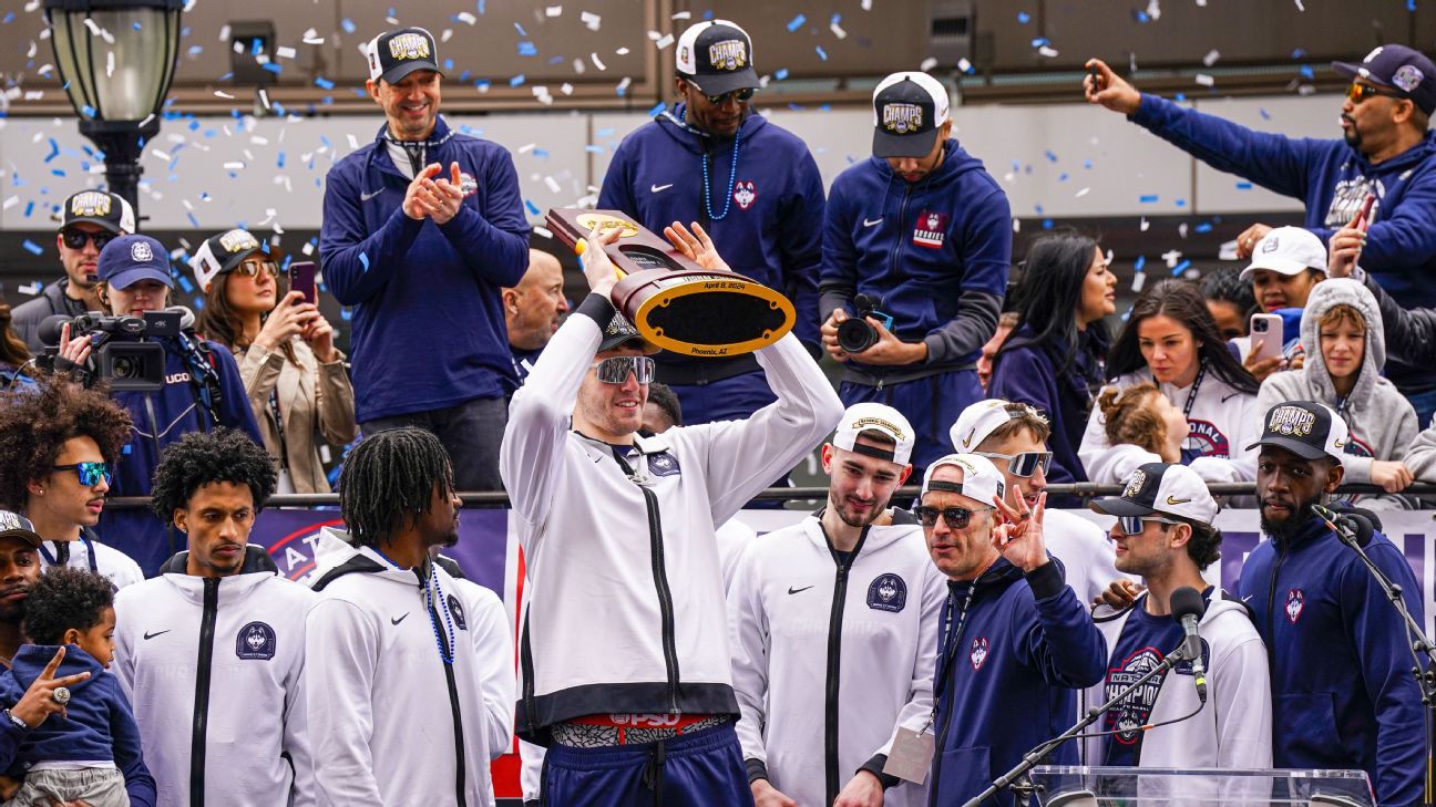 The players and coaches paraded on a double-decker bus with an open-air top and lifted the national title trophy from the state Capitol to the XL Center, the arena in which the team plays about half its home games. The procession included marching bands, cheerleaders, first responders, state politicians and other groups as fans shouted and waved UConn signs.