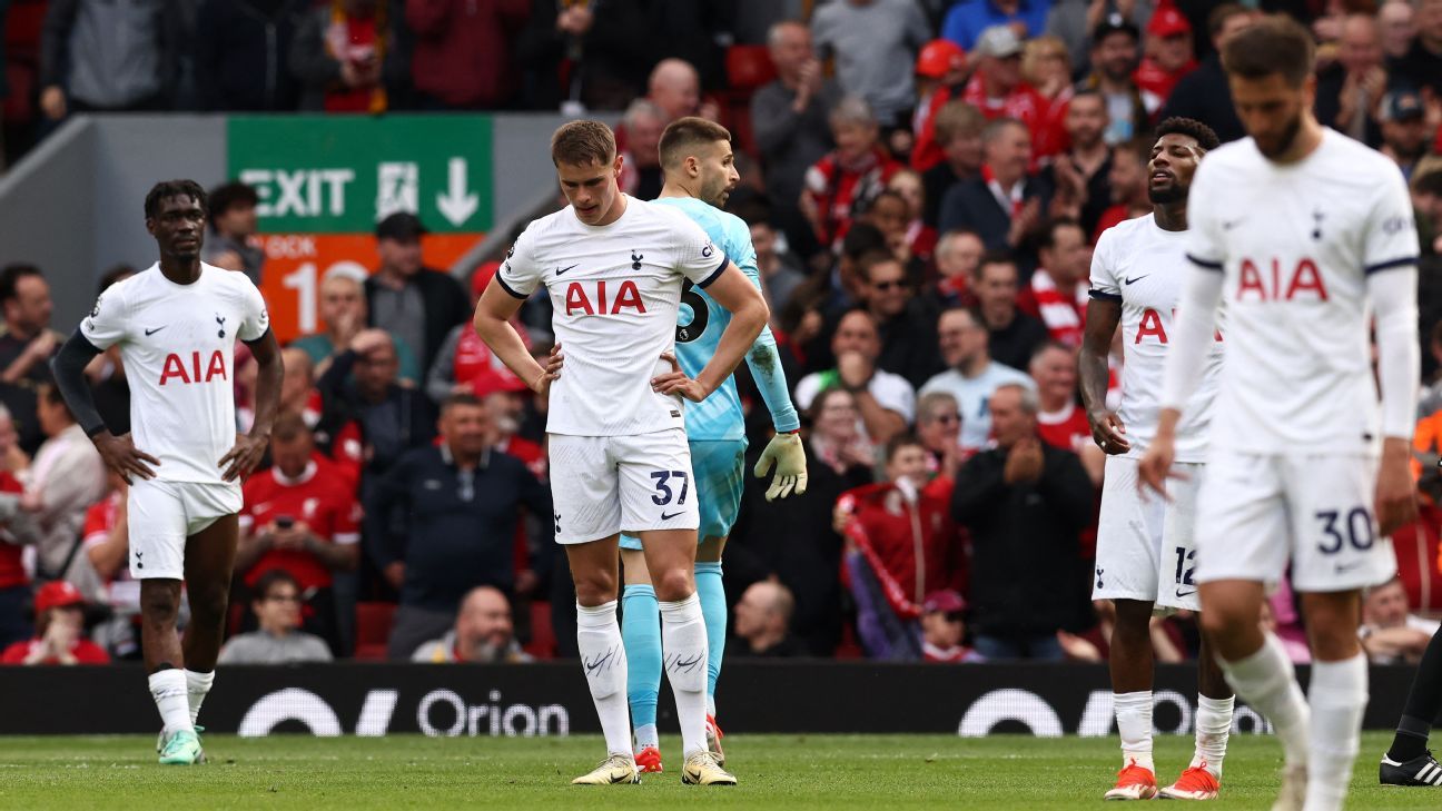 Tottenham’s Champions League qualification hopes are now hanging by a thread after a late second-half fight-back at Liverpool failed to save Ange Postecoglou’s team from a 4-2 defeat at Anfield.
