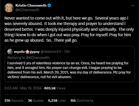 Later, a commenter pointed out to the Broadway actress that she should pray for “victims” and not “evil abusers,” to counter the comment Chenoweth came up with her own experience with abuse for the first time.