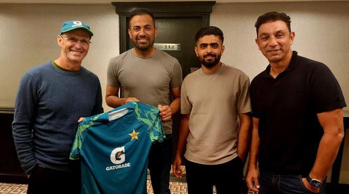 South Africa’s Kirsten, welcomed by the team’s senior manager Wahab Riaz, skipper Babar Azam and assistant coach Azhar Mahmood, was presented with the team’s training shirt in Leeds.