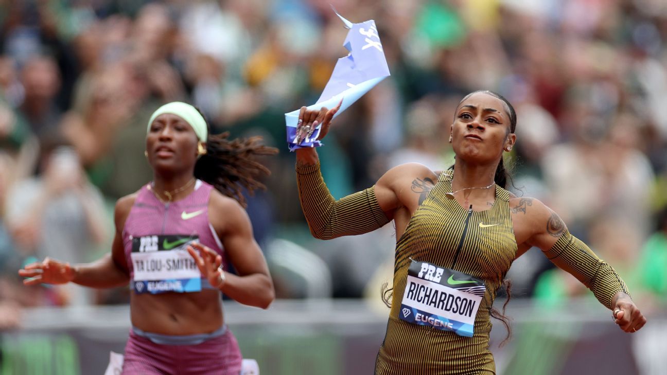Thompson-Herah faded at the Pre, finishing last in the field of nine. The charismatic Richardson muscled her way to the finish and dramatically pushed off the tape remnants.