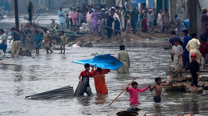 People wade through a flooded residential area after heavy monsoon rains in Karachi on August 27, 2020. — AFP