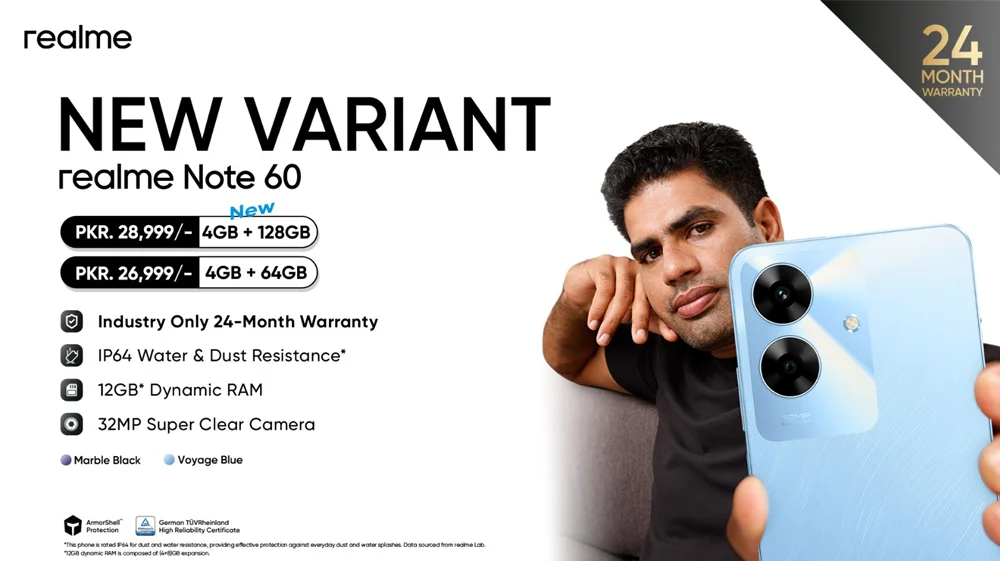 Adding to its appeal, the realme Note 60 is proudly endorsed by Arshad Nadeem, Pakistan’s Olympic gold medalist. His strength, resilience, and commitment to excellence align perfectly with the Note 60’s powerful performance and durability. As a national icon, Arshad’s endorsement further reinforces the trust and reliability of realme’s latest offering.