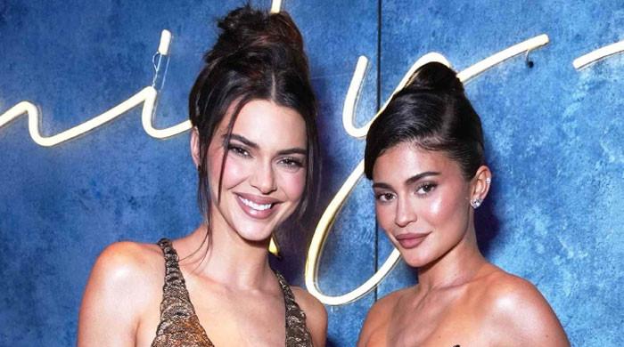 Kylie wore a black sequin tube top with matching shorts of her brand as she was copying Kendal’s awkward way of cutting.