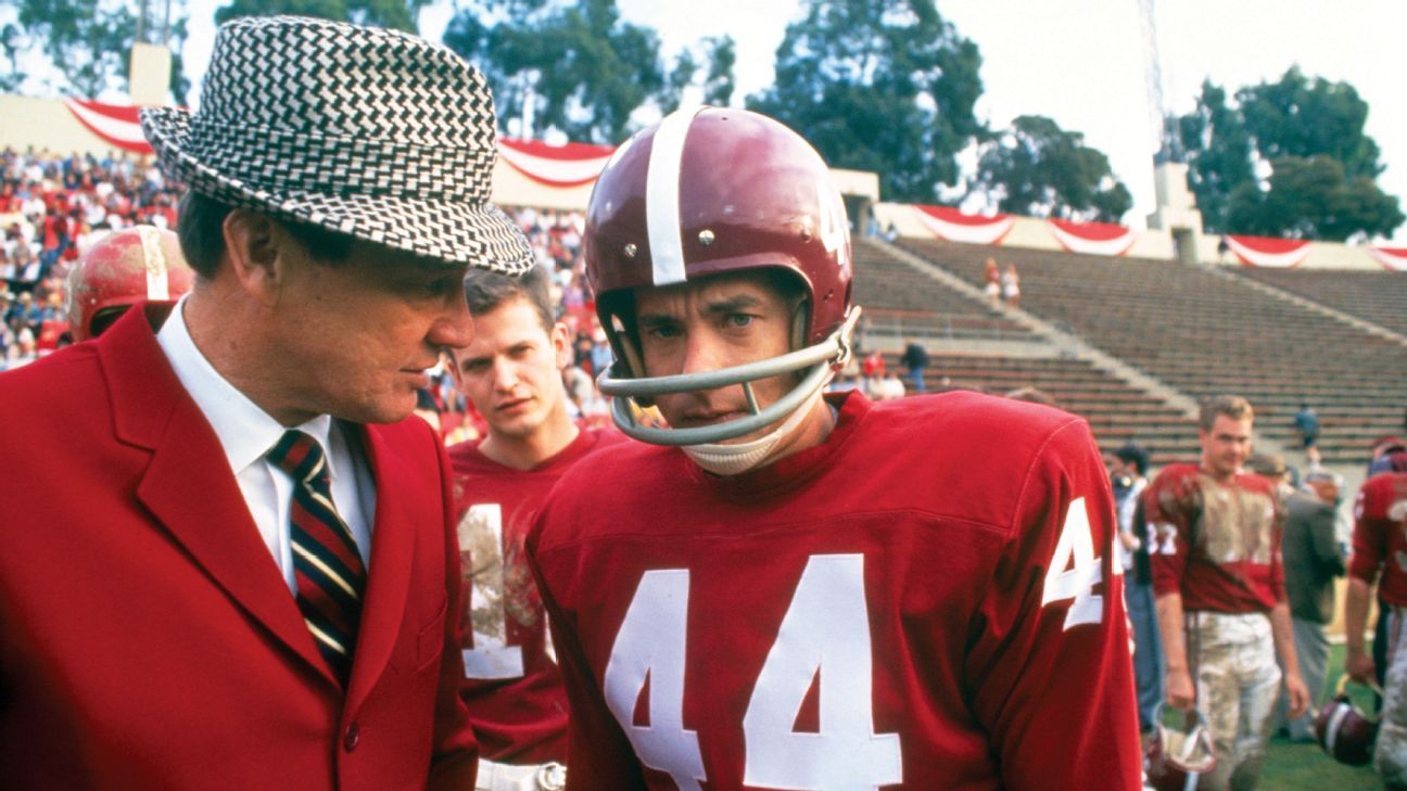 Groom’s written version of Gump was far less perfect than the character in the film. The film version was also a hell of a lot smaller. In the movie, Gump’s frame is an even 6 feet tall, weighing in at 175 pounds, which is what Tom Hanks describes as his frame at the time. In the novel, Gump is massive, standing 6-6 and making the scales creak at a hefty 240. On the written page, he doesn’t return kicks. Groom’s Bryant envisions Gump as a wide receiver and has him constantly drilling pass routes in practice. But when Gump struggles to mentally digest the playbook, Bear decides to pivot to a strategy of “We is gonna turn your big ass loose,” and Forrest Gump becomes a halfback.