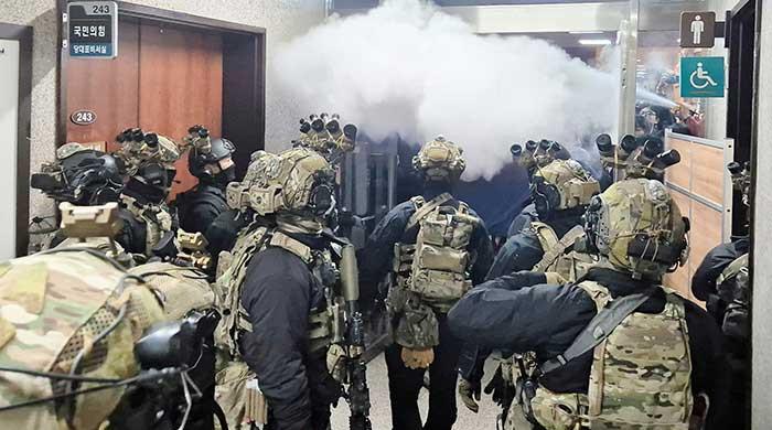 Live television footage showed troops apparently tasked with imposing martial law attempting to enter the assembly building, and parliamentary aides were seen trying to push the soldiers back by spraying fire extinguishers.