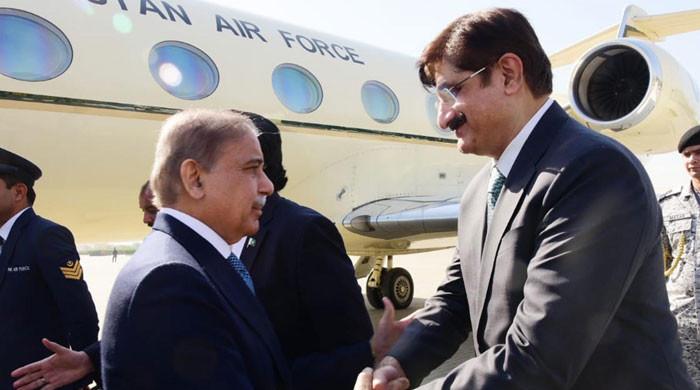 PM Shehbaz Sharif shakes hands with Sindh CM Murad Ali Shah in Karachi on January 8, 2024. — PID