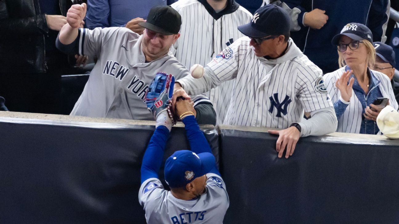 Betts leaped at the retaining wall in foul territory and caught Gleyber Torres‘ pop fly in the first inning, but a fan in the first row with a gray Yankees road jersey grabbed Betts’ glove with both hands and pulled the ball out. Another fan grabbed Betts’ bare hand.
