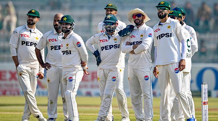 Pakistan´s players wait for the third umpire decision against West Indies´ Amir Jangoo during the second day of the second Test cricket match between Pakistan and West Indies at the Multan Cricket Stadium in Multan on January 26, 2025. — AFP
