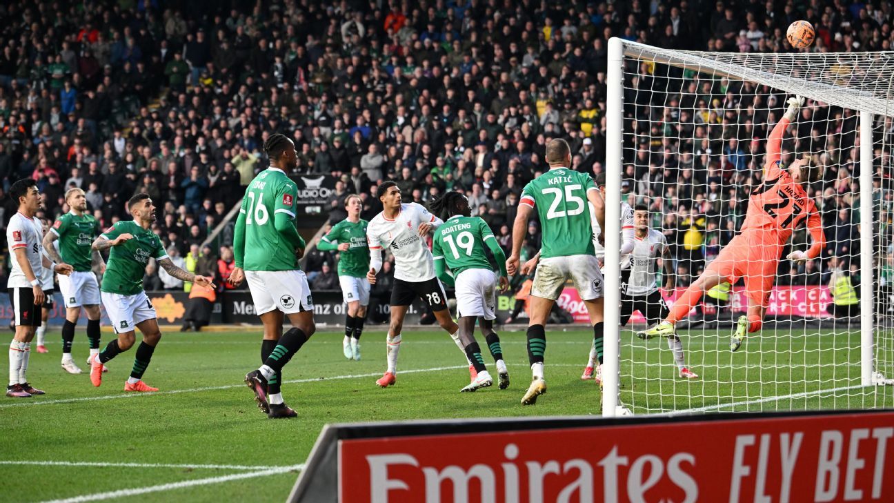 Many of the Plymouth fans at Home Park would have feared the worst when the fourth official’s board showed nine additional minutes at the end of the 90 minutes, but Hazard made a string of excellent saves — in particular from Diogo Jota and Darwin Núñez — to see his side continue their epic run despite their tribulations in English football’s second tier.