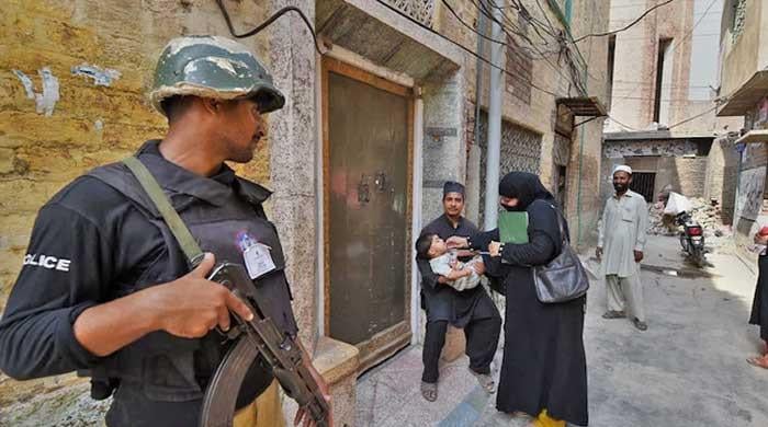 A Pakistani policeman stands guard as a health worker administers polio drops to a child during a polio vaccination campaign in Peshawar, Pakistan, on September 14, 2015. — AFP
