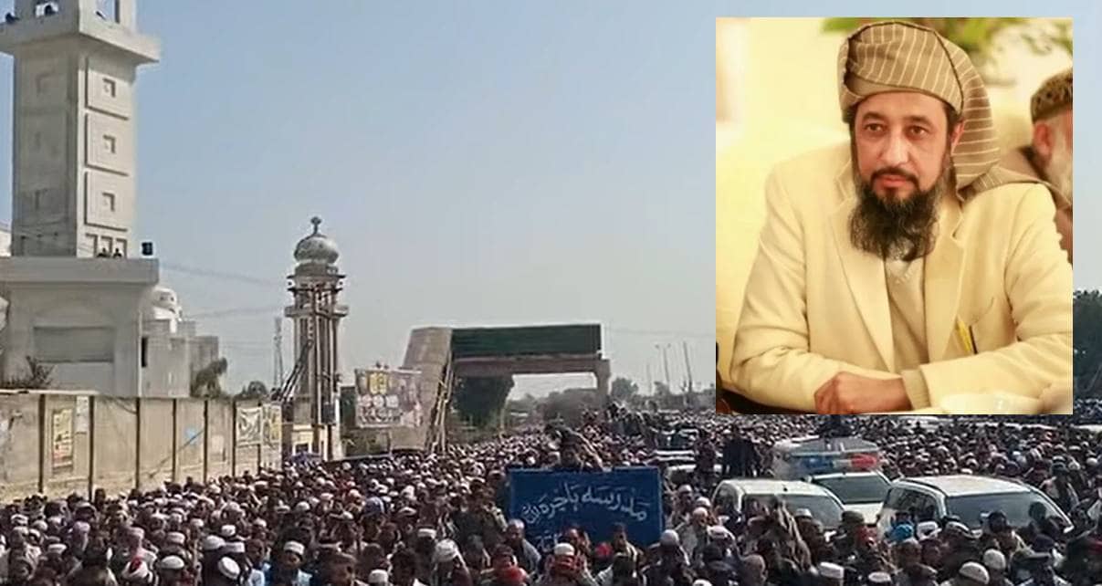 PESHAWAR – Massive crowd gathered at Madrassa Akora Khattak for Namaz-i-Janaza of Maulana Hamid ul Haq, who was martyred in a deadly bombing on Friday.