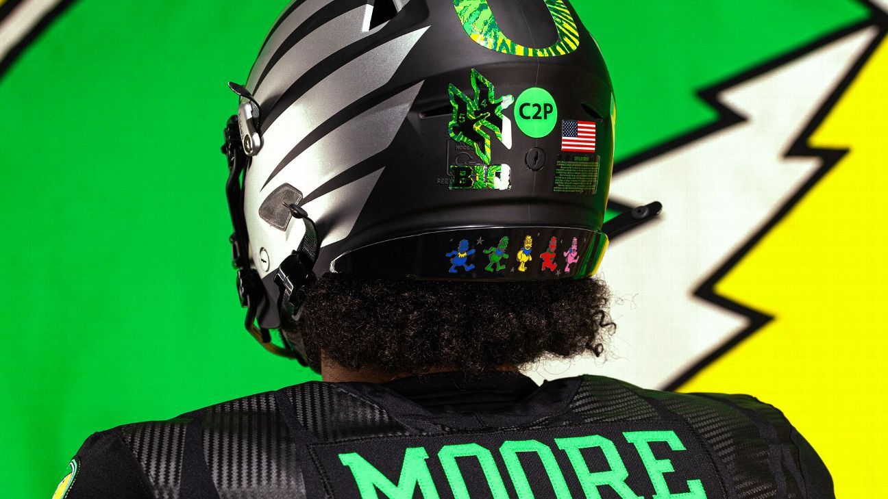Most notably, the green numbers and the trademark “O” logos on the helmet contain tie-dye patterns. The jersey shoulders contain distinct patches that mix the school’s colors with the band’s “Steal Your Face” motif. Inside the collar and on the back of the helmet is a line of the Grateful Dead’s “dancing bears” — swapping in ducks for the bears.