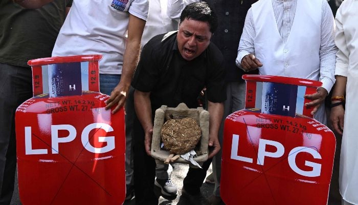 Indias Opposition Congress party workers stage a protest against the price hike and shortage of liquid petroleum gas (LPG) in New Delhi on March 13, 2026. — AFP