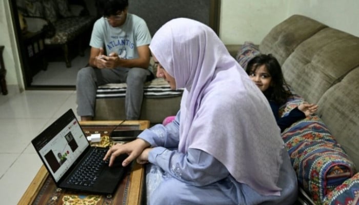 Header image caption: Dr Saniya Jafri conducts an online consultation, alongside her daughter in Karachi, in this undated image. — AFP